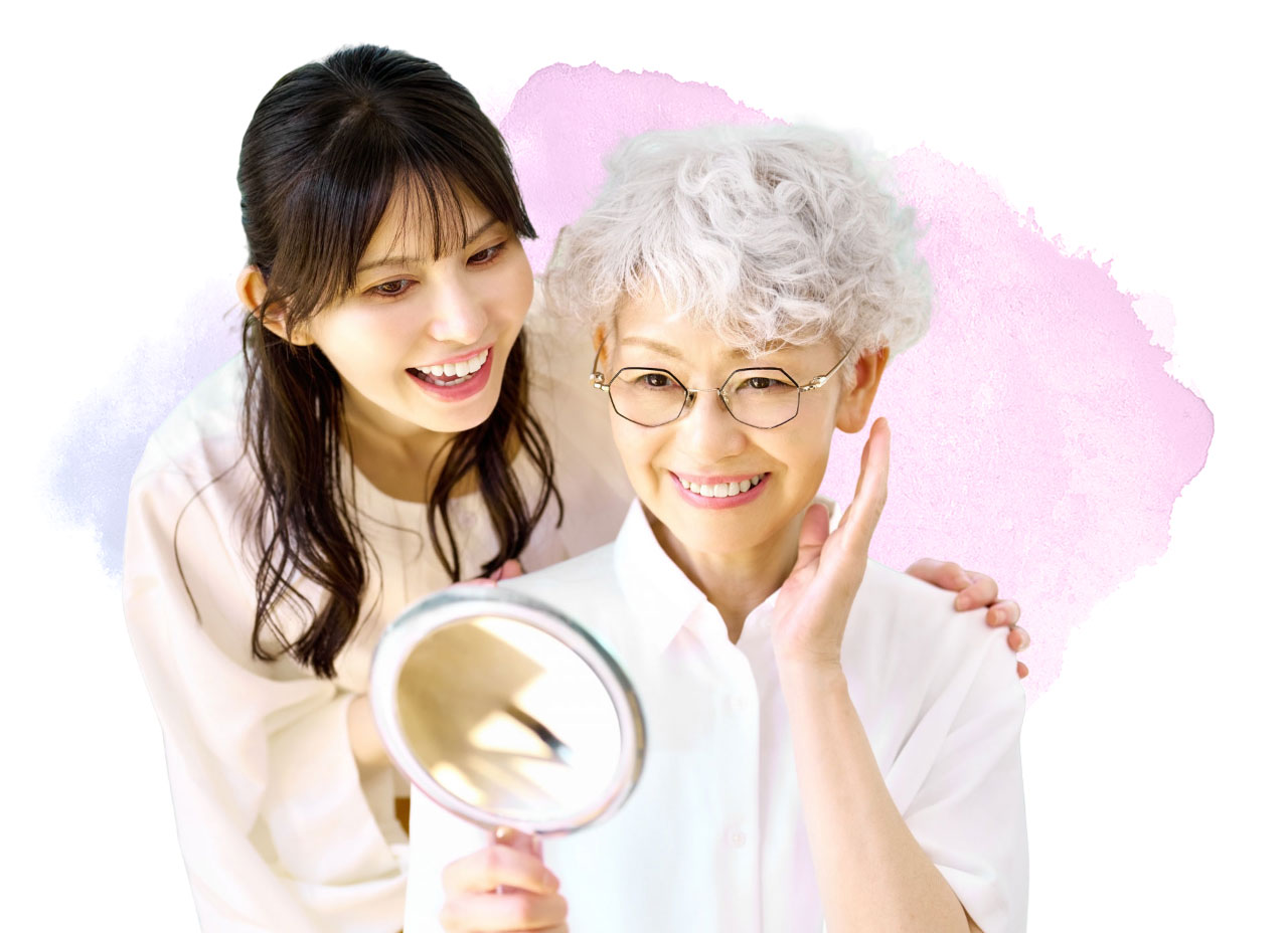 毎月美容の日は利用者の方達が、とても明るくなりベッドの上でご自分の鏡を出して楽しそうに見ていたり、事務所までわざわざ見せに来られたり、認知がとても進んでじっとしていられない方も鏡の前でおとなしくすわっているのを見て信じられず嬉しいです。