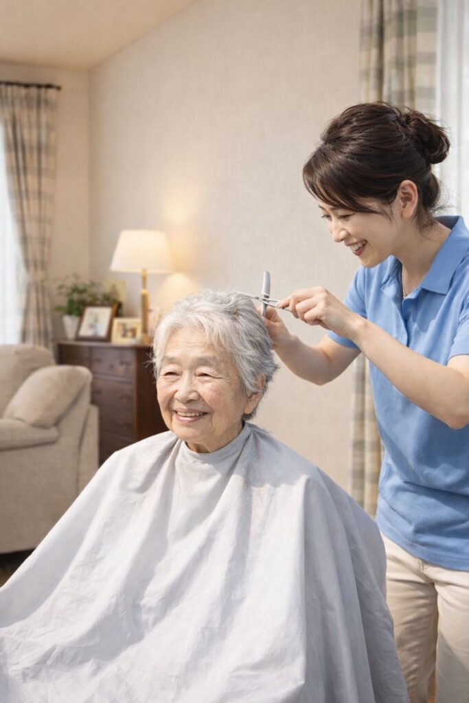 車椅子のまま鏡の前に座り、美容師さんから「今日はどんなヘアースタイルにしましょうか」と尋ねられると、どなたも一瞬、恥ずかしそうな表情になります。