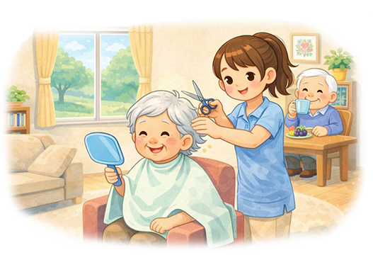 福祉施設・医療施設に出張し、プロの美容師がその場で整髪をするサービスです。