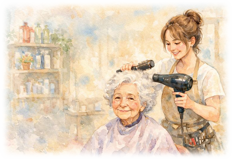 看護師・社会福祉士等からの研修を受けた、介護技術のある専看護門の美容師がお伺いします。